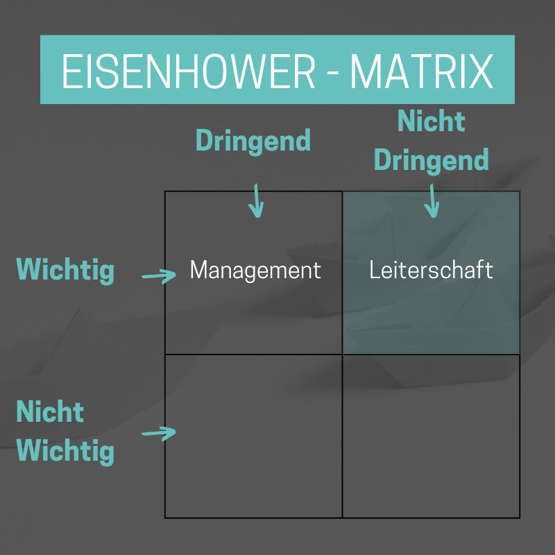 Die Eisenhower-Matrix teilt Aufgaben aufgrund von den zwei Faktoren „dringend“ und „wichtig“ in vier Kategorien (siehe Abbildung). Managementaufgaben beziehen sich eher auf wichtige und dringende Aufgaben, also das „Tagesgeschäft“: Die Vorbereitung der nächsten Veranstaltung oder der Ausbau der Räumlichkeiten. Echte Führungsaufgaben sind meistens nicht unmittelbar dringend, aber sehr wichtig: Die Ausarbeitung eines Positionspapiers oder ein kritisches Mitarbeitergespräch. Kurz: Es braucht mehr Arbeit AN der Kirche, statt IN der Kirche.